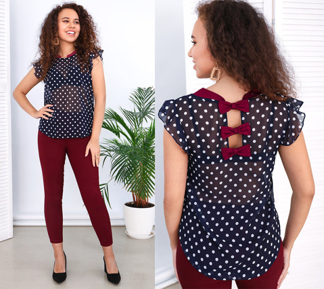 Темно-синя блуза в білий горошок шиється з шифону. Тканина дуже легка, добре пропускає повітря і дуже проста в догляді. Горловина виробу овальної форми, декорована комірцем. Короткі рукави у формі крилець надають блузі особливої легкості і ніжності. Спинка прикрашена прямокутним вирізом із трьома декоративними бантиками з тканини.