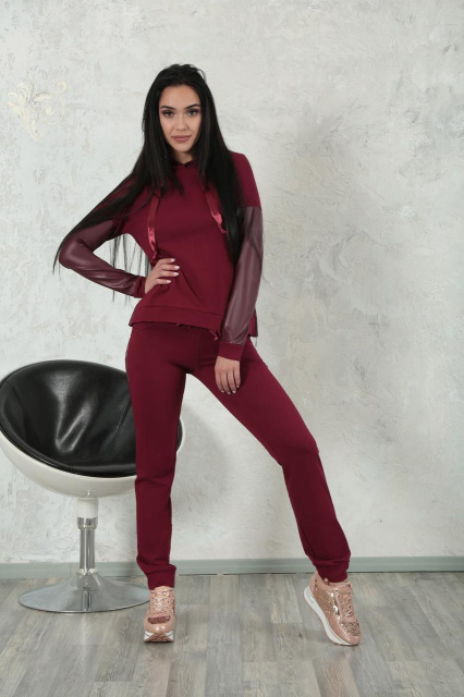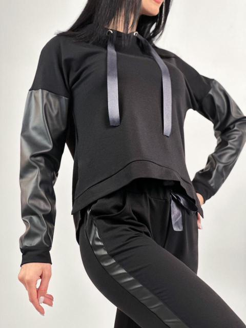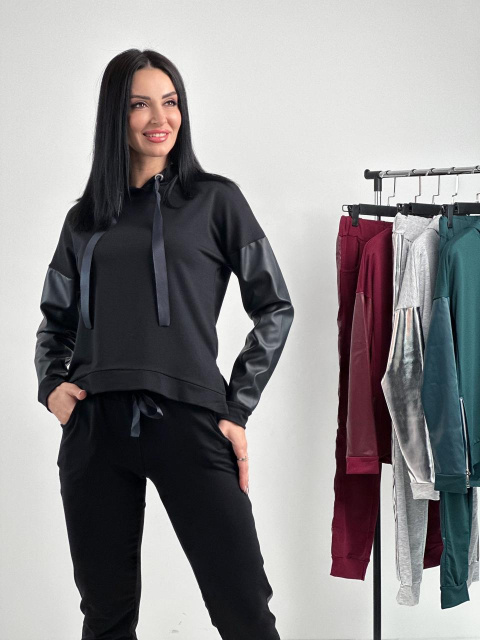 Жіночі спортивні костюми з капюшоном цієї лінійки складаються зі штанів і худи прямого крою. Родзинка моделі – вставки на рукавах та на штанах з екошкіри. Основний матеріал комплекту – комфортний та практичний трикотаж. Капюшон оснащений яскравою стрічкою, яка також привертає увагу.