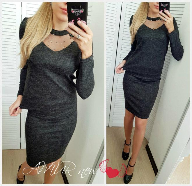 Костюм складається з двох деталей – спідниці і кофти. Спідничка прямого приталеного крою з поясом на резинці. Кофта з довгим рукавом і круглим вирізом горловини. Родзинка моделі – розкішне декольте із прозорої ніжної сіточки. Виріз декорований круглими намистинами – виглядає дуже красиво і таємничо.