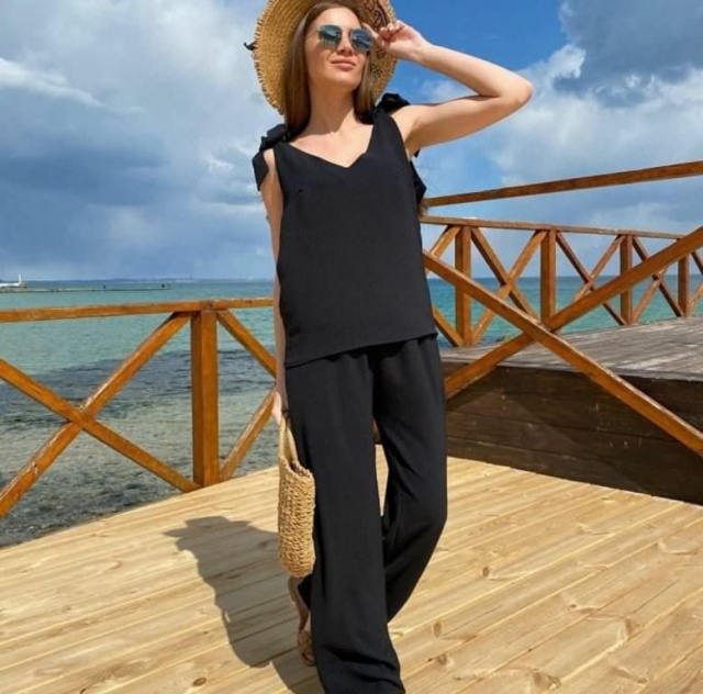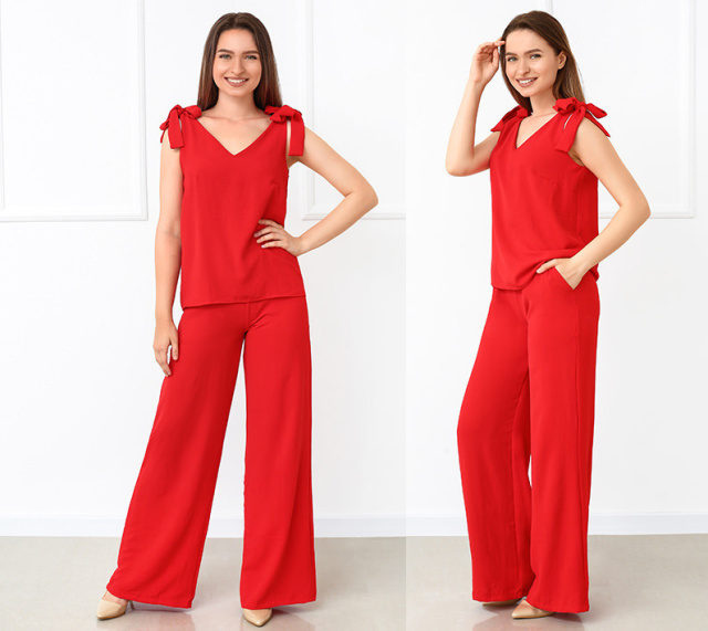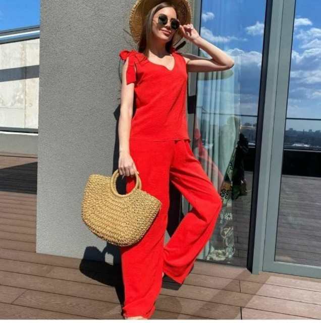 Прогулянковий літній костюм "Ясмин" Розниця (не дропшипінг) – 515 грн Хочете оновити літній гардероб гуртом і недорого? ТМ Fashion Girl — найкраще рішення. Ми гарантуємо чудову якість наших виробів, доступні гуртові/різничні ціни, а також гнучкі умови співпраці. Наша трендова новинка підкорить серце кожної жінки! Стильний літній костюм із широкими штанами доступний до замовлення в чотирьох модних кольорах. Напрочуд зручний і приємний до тіла комплект прикрасить жіночу фігуру та додасть образу чарівності. Модель складається з блузи прямого крою та широких штанів. Верх без рукавів — на плечах виріб зав'язується на кокетливі бантики. Плавільну посадку забезпечують виточки на грудях. Виріз має V-подібну форму як спереду, так і ззаду. Низ комплекту — штани модного фасону палацо. Вони мають високу посадку, пояс на гумці та дві кишені. Виготовлений літній костюм із американського крепу жатки. Матеріал із приголомшливо приємною текстурою — дарує шкірі відчуття легкої прохолоди навіть у найспекотніший день. Доглядати за одягом із жатки нескладно: рекомендуємо ручне або машинне прання за невисокої температури води та без використання агресивних мийних засобів. Придбати костюм із широкими штанами можна в різних розмірах до 52-го — вибирайте свій за допомогою і жмілте на кнопочку "Купити"! Ми гарантуємо швидкий сервіс і якість товару! Характеристики Стиль:Сasual Сезон:Лето Довжина кофти від плеча (регулюється):55-58 см Довжина крокового шва: 81-82 см Довжина бічного шва: 107-110 см Матеріал:Американський креп жатка Наявність на складі Колір 42 44 46 48 50 52 Чорний ✓ ✗ ✓ ✗ ✗ ✓ Червоний ✓ ✓ ✓ ✓ ✗ ✓ Хакі ✓ ✓ ✓ ✓ ✓ ✓ Блакитний ✓ ✓ ✓ ✓ ✗ ✓ ✓ — у наявності (кількість обмежена). ✗ — немає в наявності (знято з виробництва). Наші переваги Весь товар у наявності Відправка за 24 години 100% як на фото Найвигідніші ціни Обмін і повернення Гарантія якості