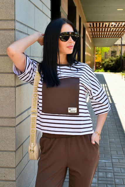 Спортивний костюм "Bridge" Роздріб (не дропшипінг) – 715 грн Також у наявності . Смужка та спортивний стиль – ідеальне поєднання двох літніх трендів. Новий костюм "Bridge" від ТМ Fashion Girl зібрав у собі все, що так люблять активні модниці будь-якої пори року: прямий вільний крій, гарний колір та стильний декор. Особливості моделі Костюм-двійка "Bridge" відрізняється такими особливостями: - вільний крій; - верх – пряма футболка зі смугастим принтом та однотонною нашивкою у колір штанів, низ – прямі спортивні штани з бічними кишенями; - спущена лінія плеча; довжина рукава – до ліктя; - вільні штани з м'якою гумкою на поясі та манжетах; - нашивка-лейбл у нижньому лівому кутку однотонного квадрата. Завдяки універсальному фасону футболку та штани можна носити як у комплекті, так і окремо, комбінуючи їх з іншими речами у спортивному стилі. Вільна футболка з модним принтом буде доречна в гардеробі будь-якої активної жінки. Верх костюма пошитий з якісної турецької кулірки – ніжної та комфортної бавовняної тканини, яка чудово пропускає повітря, вбирає вологу та не викликає алергії. Штани виготовлені з м'якої двонитки. Щоб костюм довго залишався яскравим і приємним на дотик, рекомендується прати його в делікатному режимі, при низькій температурі (до 30 градусів) та окремо від твердих матеріалів (робочого одягу, текстилю та ін.). ТМ Fashion Girl пропонує купити літній спортивний костюм у смужку оптом та за найкращою ціною. У нас завжди хороші умови для оптовиків, дропшиперів, а також організаторів сумісних покупок. Шопінг на fashion-girl.ua – це завжди вигідно, яскраво та просто! Характеристики Стиль:Спортивний Сезон:Літо Довжина футболки:55-56 см Довжина рукава від горловини:44-45 см Довжина крокового шва:70-71 см Довжина бічного шва:95-96 см Матеріал:Турецький кулір, двунитка Наявність на складі Колір 42-44 46-48 Капучино ✓ ✓ Джинс ✓ ✓ Зелений ✓ ✓ Чорний ✓ ✓ Шоколадний ✓ ✓ ✓ — в наявності (кількість не обмежена). ✗ — немає в наявності (знято з виробництва). АКЦІЇ ТА ЗНИЖКИ ПОДАРУНОК ПРИ КУПІВЛІ ВІД 3-Х ОДИНИЦЬ При купівлі від 3 од. будь-якого товару в одній посилці, не включаючи позицій з розпродажу та розділу "Все по 95" ДОДАТКОВА ЗНИЖКА При покупці від 25 од. будь-якого товару в одній посилці (акції не підсумовуються) Наші переваги Весь товар в наявності Відправка за 24 години 100% як на фото Найвигідніші ціни Обмін та повернення Гарантія якості