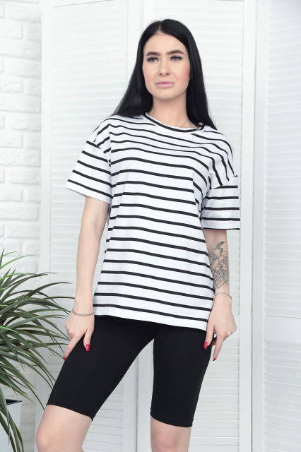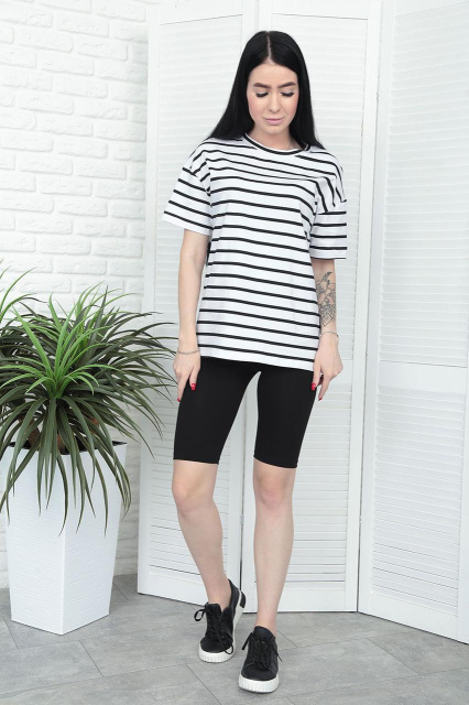 - футболка з принтом у горизонтальну смужку, однотонні велосипедки;