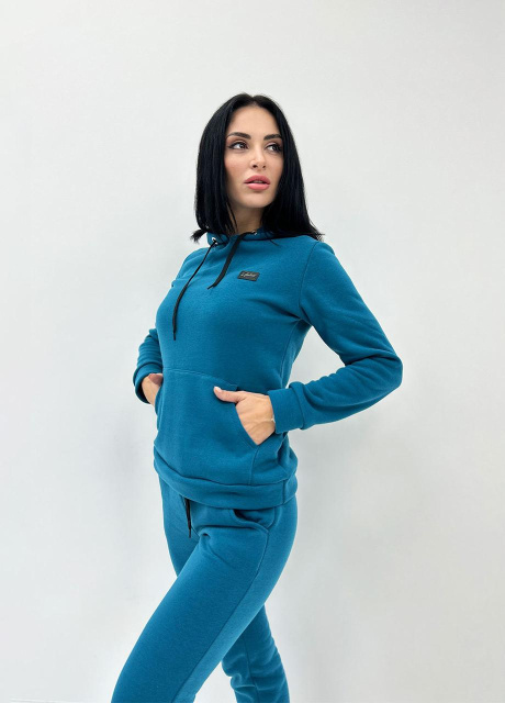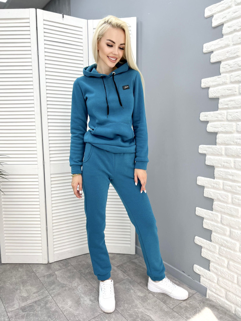 Модель складається з полуприталенных штанів з кишенями і худі. Для пошиття використаний трикотажний матеріал – тринитка з флісом. М'який і теплий наряд – відмінний варіант для прохолодних весняних, осінніх і зимових днів. Комплект ідеально сідає по фігурі, підкреслюючи її переваги.