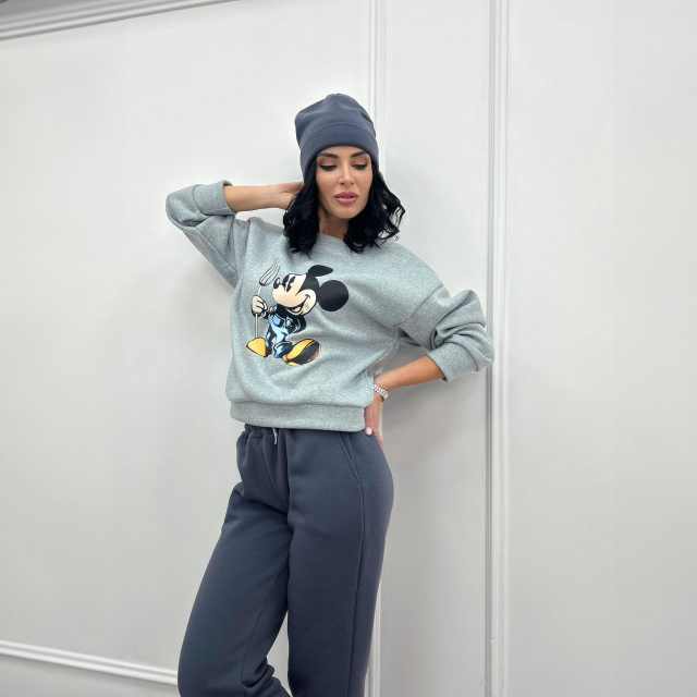 Спортивні речі з незвичайним принтом – трендова модель сезону. Яскравий і грайливий світшот у класичному сірому кольорі з зображенням Міккі Мауса стане не тільки джерелом тепла, а й чудовим доповненням до гардеробу, вносячи в нього нотку веселощів та стилю.