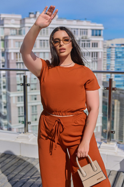 Літній жіночий костюм із жатки «Oasis» оптом | Норма | Розпродаж моделі Теракотовий, 46-48