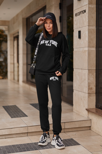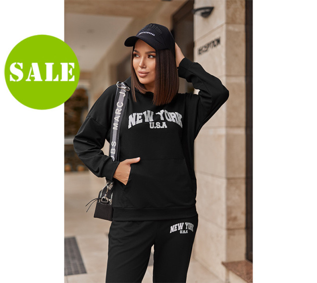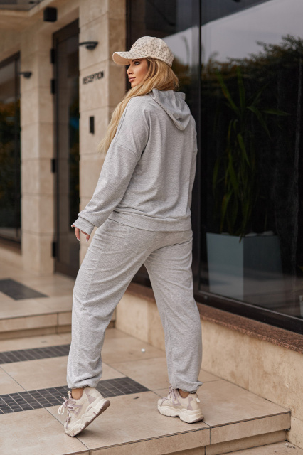 Жіночий трикотажний костюм не обмежує рухів та добре виглядає на фігурі будь-якої комплекції. Верх комплекту – класична кофта-худі. Низ виробу та рукава з манжетом, лінія плеча спущена, глибокий капюшон без люверсів та шнурка. Низ наряду – штани із високою посадкою. Пояс та манжети штанин також нарезинці, спереду та ззаду є по дві кишені.