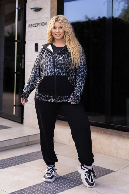 Кофта виготовлена з м'якого і приємного на дотик велюру з ефектним леопардовим принтом, який додасть вашому образу нотки зухвалості та оригінальності. Блискавка по всій довжині робить кофту зручною для швидкого надягання, а капюшон додає стиль та захист від негоди. Кишеня-кенгуру - це не тільки практичний елемент для зберігання дрібниць, але і стильна деталь, яка додає образу спортивної динаміки. Манжети на рукавах забезпечують хорошу посадку та зберігають тепло.