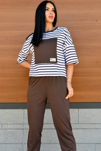 - верх – пряма футболка зі смугастим принтом та однотонною нашивкою у колір штанів, низ – прямі спортивні штани з бічними кишенями;