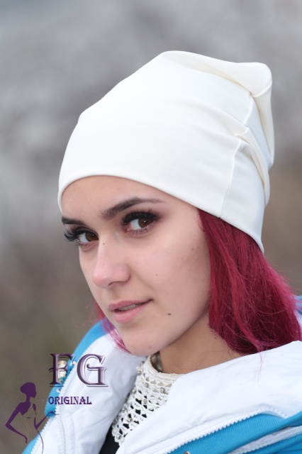 Модель фасону «біні» виготовлена з якісного трикотажу, м'яка текстура якого приємно прилягає до шкіри. Натуральний матеріал не збирає статичну енергію, не електризуючи волосся, що теж важливо при підборі виробу. Також вона представлена яскравою та насиченою колірною гамою, що дозволить розбавити осінні похмурі дні. Фасон «біні» підійде дівчатам з вузьким обличчям або гострою лінією підборіддя. Тканина невибаглива у догляді, легко переться в машинці, не порушуючи цілісну фактуру тканини.