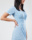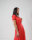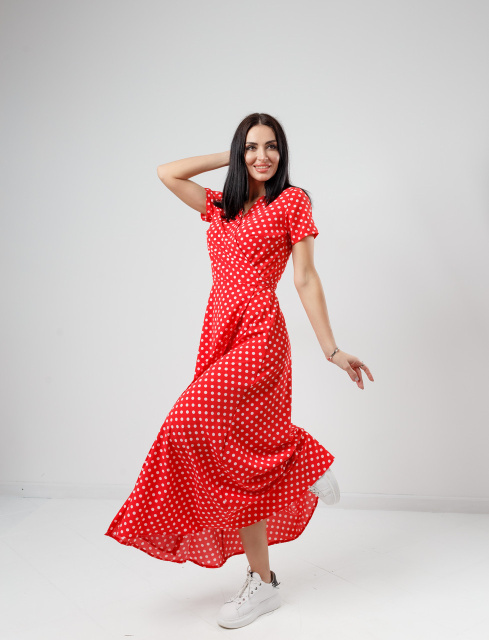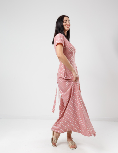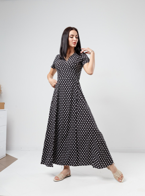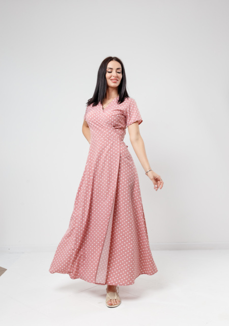 Модель з довжиною максі має глибокий V-подібний виріз на запах, короткий рукав і розкльошені нижню частину. Фіксується на талії поясочком. Виріб представлено в декількох варіантах кольорів і прикрашена принтом у вигляді дрібного горошку.