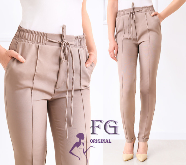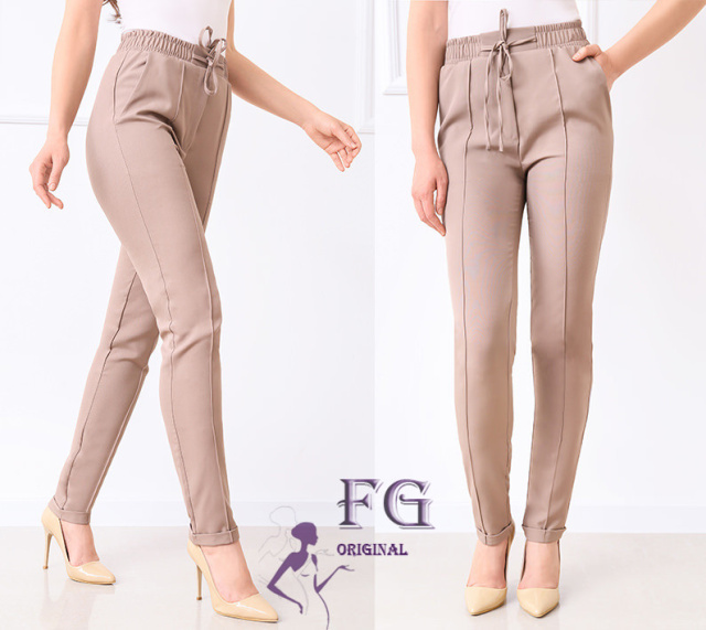 Брюки з високою посадкою мають пояс на резинці, красиво сідають по фігурі, підкреслюючи округлість стегон. Стрілки на штанинах візуально витягую силует і роблять ніжки стрункішими. Оригінальна модель з кишенями в області стегон і підворотами на штанинах виглядають однаково стильно як з модельним взуттям на підборах, так і зі спортивним на низькому ходу.