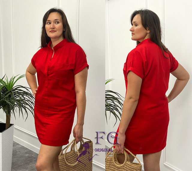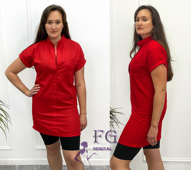 Коротка жіноча туніка прямого вільного крою вдало приховає проблемні місця і подарує свободу рухів. Виріб має комірець-стоечку та короткі рукави з вилогами. Спереду є один нагрудний кишеню. Колірна гамма моделі представлена трьома відтінками – спокійними капучіно і хакі і яскравим червоним.