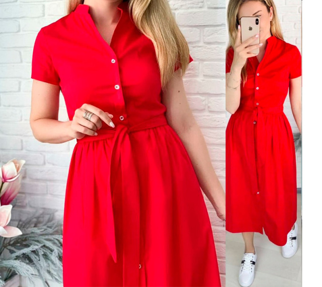 Сукня з короткими рукавами на гудзиках має напівприталений верх, відрізну талію і вільну спідницю довжини міді. В комплекті є знімний поясок, за допомогою якого можна акцентувати талію.