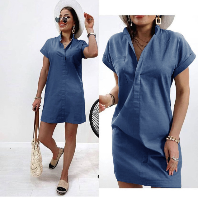 Жіноче лляне плаття літнє, безсумнівно, підкорить серця українських модниць своїм дизайном. На перший погляд може здатися, що це проста модель прямого вільного крою. Але вся принадність цього плаття в його скромної стриманості. Закритий верх виробу органічно компенсується його короткою довжиною до середини стегна. Плаття має комір-стійку, короткі рукавчики з закотами й одну нагрудну кишеню.