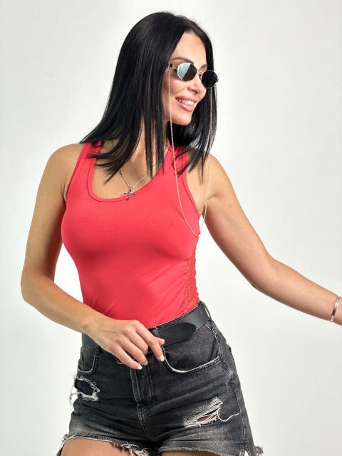 Майка красиво виділяє лінію талії, плечі і груди. Фасон «борцовка» облягаючого силуету гарно ляже на будь-які обсяги фігури. Жіноча еластична майка прилягає до тіла впритул і при цьому не сковує рухів, що робить її максимально комфортною. Круглий виріз горловини і широкі бретелі підкреслюють строгі лінії грудей.