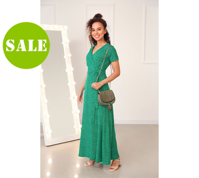 Модель з довжиною максі має глибокий V-подібний виріз на запах, короткий рукав і розкльошені нижню частину. Фіксується на талії поясочком. Виріб представлено в декількох варіантах кольорів і прикрашена принтом у вигляді дрібного горошку.