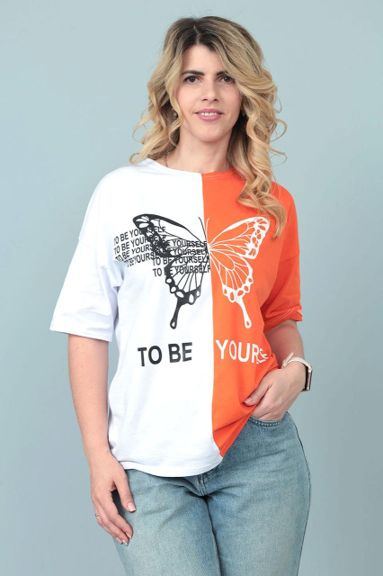 UA MarketВінницяGhjhgТовари та послугиЖіночий одяг батал (розмір 50+) оптомФутболки та майки жіночі батал оптомДвокольорова футболка «Butterfly» оптом | Батал | Розпродаж моделі Помаранчевий, 54-56