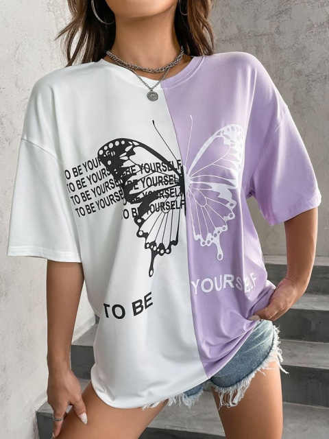 UA MarketВінницяGhjhgТовари та послугиЖіночий одяг батал (розмір 50+) оптомФутболки та майки жіночі батал оптомДвокольорова футболка «Butterfly» оптом | Батал | Розпродаж моделі Ліловий, 54-56