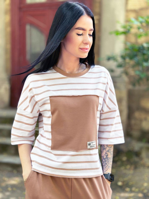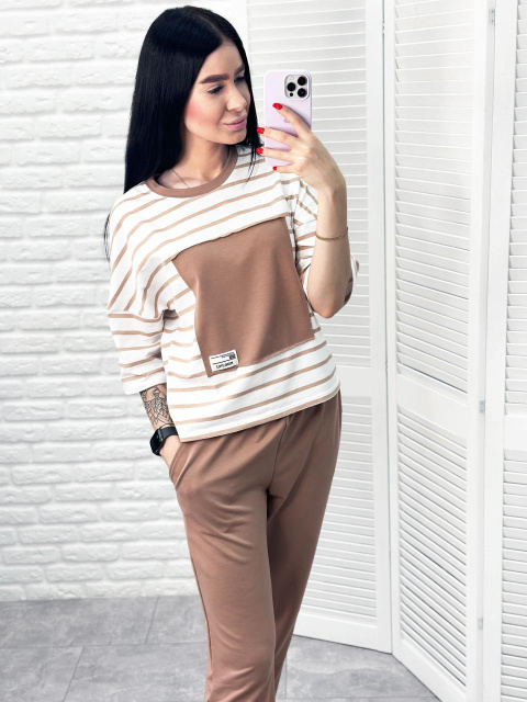 - верх – пряма футболка зі смугастим принтом та однотонною нашивкою у колір штанів, низ – прямі спортивні штани з бічними кишенями;