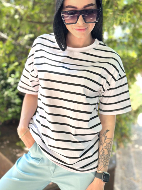 UA MarketВінницяGhjhgТовари та послугиФутболки жіночі оптомПодовжена футболка в смужку «Modis» оптом від виробника | Норма і батал