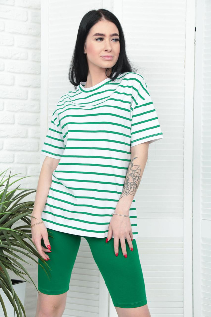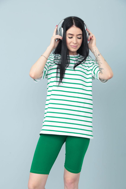 - футболка з принтом у горизонтальну смужку, однотонні велосипедки;