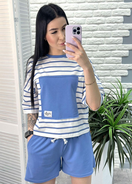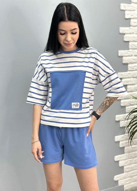 Простора смугаста футболка пошита з турецького куліра – якісної тканини, що на 95% складається з бавовни. Матеріал забезпечує хорошу вентиляцію, добре вбирає вологу і приємний до тіла. За рахунок вільного крою він драпірується навколо силуету м'якими складками. Шорти виготовлені із трикотажу двонитки. Цей матеріал міцний, зносостійкий та простий у догляді.