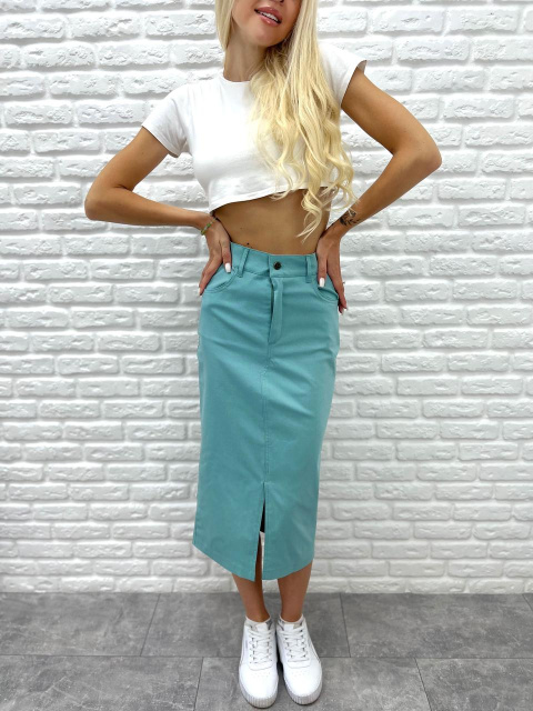 Спідниця міді з розрізом «Brooklyn» оптом | Розпродаж моделі Фісташковий, 46