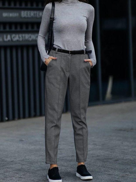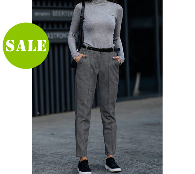 Пояс штанів оснащений шльовками. Щоб наголосити на талії, можна доповнити комплект шкіряним ремінцем. Завдяки високій посадці пояс створює вигідний контраст талії та стегон. Вертикальні стрілки завершують образ, візуально подовжуючи ноги та коригуючи силует.