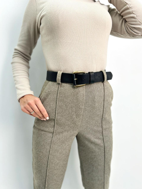 Пояс штанів оснащений шльовками. Щоб наголосити на талії, можна доповнити комплект шкіряним ремінцем. Завдяки високій посадці пояс створює вигідний контраст талії та стегон. Вертикальні стрілки завершують образ, візуально подовжуючи ноги та коригуючи силует.