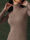 Суворий силует з довгими рукавами та коміром-гольф підкреслює фігуру, але не акцентує увагу на дрібних недоліках.