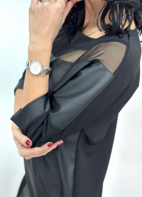 Прозорі деталі на рукавах і грудях додають сукні родзинку, роблячи її не тільки стильною, але й спокусливою, не виходячи при цьому за рамки елегантності. Сукня представлена в універсальному чорному кольорі, що робить її ідеальним доповненням до будь-якого гардеробу. Ця сукня – обов'язковий елемент для тих, хто бажає поєднувати у своєму образі класику та модні тенденції.