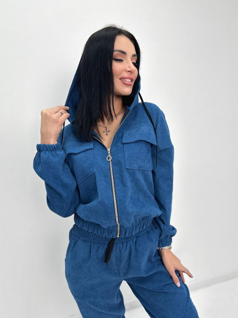 Фасон костюма "Demien" пророблений до дрібниць, щоб підкреслити переваги будь-якої фігури. Укорочений вільний верх із накладними кишенями підкреслює бюст та контраст між грудьми та талією. Капюшон і застібка-"блискавка" роблять кофту максимально зручною та функціональною. Спортивні штани з резинками внизу моделюють силует та гарантують зручність під час руху.