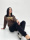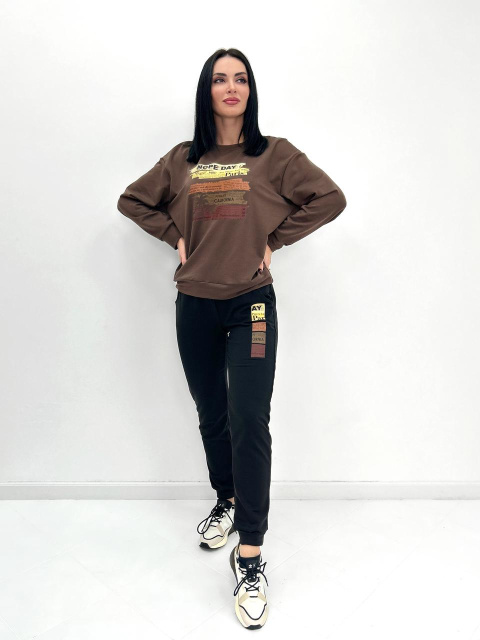 Верх костюма – вільний світшот зі спущеною лінією плеча та класичною круглою горловиною. Лаконічний дизайн ідеально поєднується з великою контрастною наклейкою, прикрашеною написами та малюнками. Штани з манжетами внизу забезпечують неперевершений комфорт та надають образу сучасного шарму.