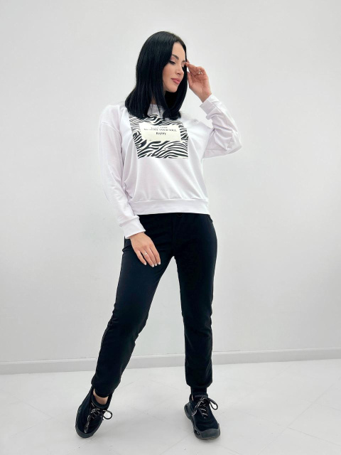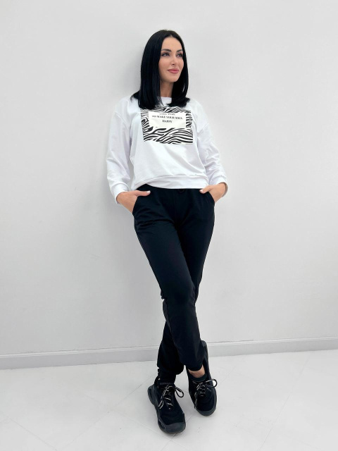 Спортивний костюм з зебровим принтом Роздріб (не дропшипінг) – 600 грн Також в наявності . Відкриваємо стильний сезон з демісезонним спортивним костюмом "Condor", який чудово поєднує комфорт та сучасні тренди. Комплект складається з класичних спортивних штанів та світшота, який можна поєднувати з іншим низом: наприклад, джинсами, брюками чи лосинами. Головна особливість нової моделі – стильний анімалістичний принт, який знову в тренді в 2024 році. Світшот має круглу горловину, спущену лінію плеча та вільний крій, що забезпечує комфорт у русі. Штани, доповнені зручними манжетами, не тільки ідеально сидять на фігурі, але підкреслюють динамічність образу. Ми приділили особливу увагу матеріалам: "Condor" виконаний з двонитки, довговічної та дуже приємної на дотик. Цей костюм стане вашим відданим супутником як у міських пригодах, так і під час активного відпочинку. Спортивні костюми опт та дропшипінг Якщо вам потрібно купити жіночі теплі спортивні костюми оптом та за гарною ціною, замовте у виробника безпосередньо! Fashion Girl пропонує вигідні умови для оптовиків та дропшиперів. У нас ви знайдете доступні ціни та гарна якість. В асортименті завжди багато модних новинок. Ми швидко вирішуємо питання обміну та повернення та надсилаємо замовлення протягом доби після підтвердження замовлення. Характеристики Стиль:Спортивний Сезон:Весна/осінь Довжина кофти від плеча: 62-63 см Довжина рукава від горловини:69-70 см Довжина крокового шва:74 см Довжина бічного шва: 97-98 см Матеріал:Двонитка Наявність на складі Колір 50-52 54-56 Чорний+чорний ✓ ✓ Білий+чорний ✓ ✓ Білий+графіт ✓ ✓ ✓ — в наявності (кількість не обмежена). ✗ — немає в наявності (знято з виробництва). АКЦІЇ ТА ЗНИЖКИ ПОДАРУНОК ПРИ КУПІВЛІ ВІД 3-Х ОДИНИЦЬ При купівлі від 3 од. будь-якого товару в одній посилці, не включаючи позицій з розпродажу та розділу "Все по 95" ДОДАТКОВА ЗНИЖКА При покупці від 25 од. будь-якого товару в одній посилці (акції не підсумовуються) Наші переваги Весь товар в наявності Відправка за 24 години 100% як на фото Найвигідніші ціни Обмін та повернення Гарантія якості