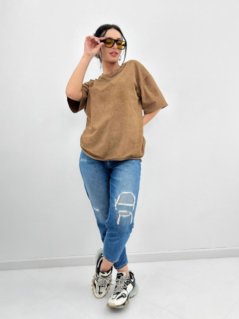 Завдяки вільному крою та рукавам до ліктя футболка дуже комфортна при русі та ідеально підійде для літнього прогулянкового комплекту. Ті, хто віддає перевагу більш приталеним і спокусливим образам, можуть носити футболку зав'язаною на поясі і з облягаючими джинсами.