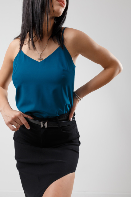 "Infiniti" пропонує елегантний V-подібний виріз та тонкі бретелі, які підкреслюють шию та плечі, додаючи витонченості будь-якому образу. Легкість тканини забезпечує комфорт на весь день, а широкий вибір кольорів дозволяє вписати її у будь-який стиль та сезон.