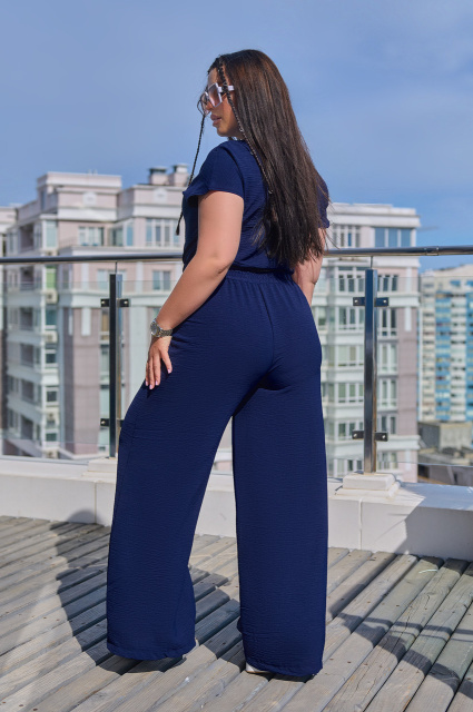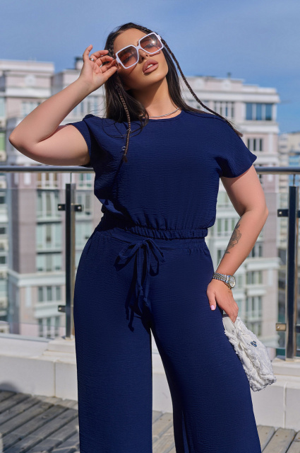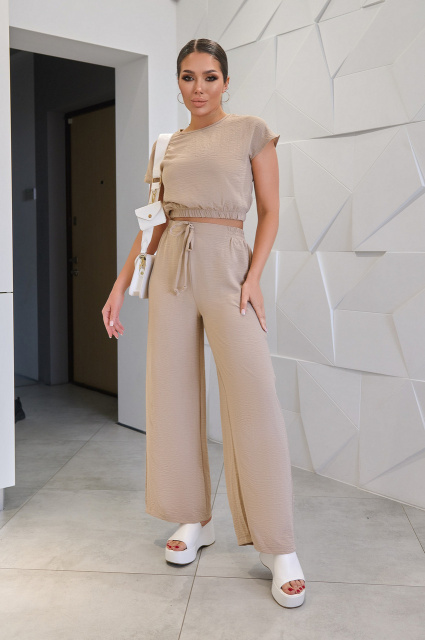 Костюм включає блузу-топ на гумці і широкі штани з високою посадкою. М'які гумки та пояс забезпечують ідеальну посадку на будь-якій фігурі. Вільний крій і м'яка тканина роблять костюм легким і приємним у носінні, а стильний зовнішній вигляд дозволяє почуватися впевнено в будь-якій ситуації.