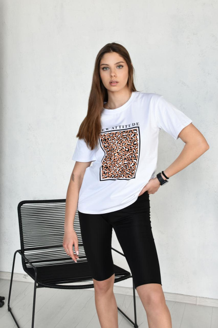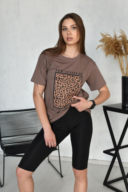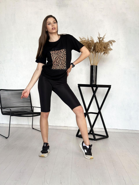 Включаючи велосипедки з мікродайвінгу і футболку з леопардовим принтом, цей комплект створює ефектний і зручний образ. Еластичний матеріал велосипедів та продуманий крій футболки підкреслюють фігуру та забезпечують ідеальну посадку. Натуральна бавовна додає м'якості і комфорту, а мікродайвінг - ефект, що стягує.