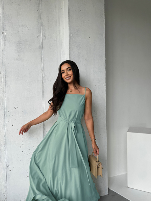 Тонкі бретелі та квадратний виріз надають йому витонченості, а знімний пояс акцентує талію, створюючи витончений силует. Довгий поділ, що струмує, додає романтичності і легкості в русі.