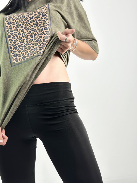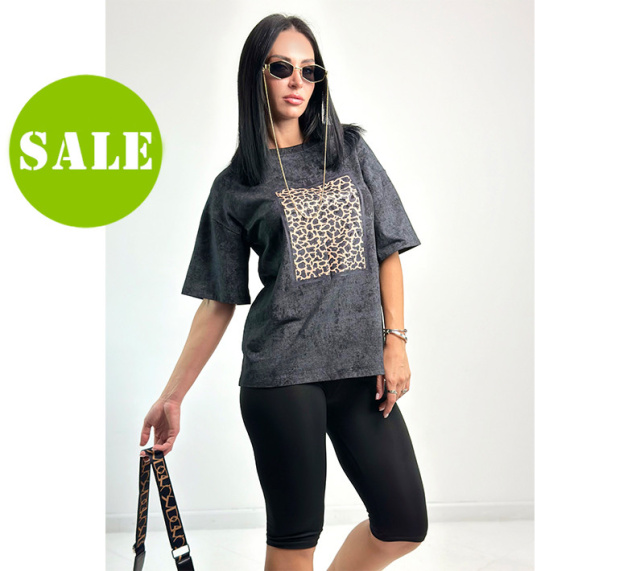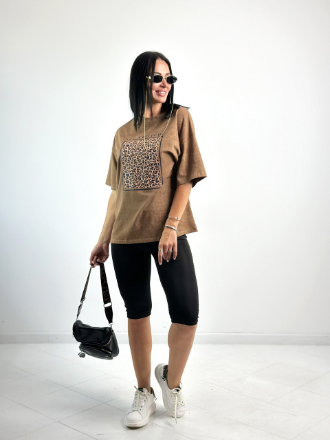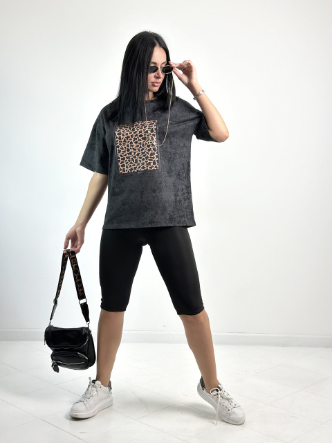 Верх комплекту – футболка вільного прямого крою. Вона виготовлена із якісного турецького куліру у трендовому забарвленні з ефектом тай-дай. Спереду має прямокутну наліпку в анімалістичному стилі.