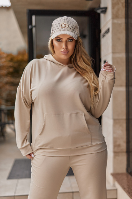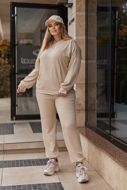 Спортивний костюм, що складається зі худі та джогерів, виготовлений з м'якої та міцної двонитки, яка забезпечує комфорт та свободу рухів. Худі має класичний крій з капюшоном та місткою кишенею-кенгуру. Рукави та низ худи виконані з еластичними манжетами, які допомагають зберігати тепло. Джогери мають зручну посадку на талії завдяки еластичному поясу, а манжети на резинці створюють ефектний силует і перешкоджають проникненню холодного повітря.